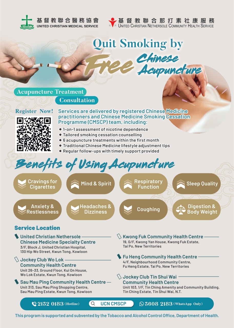United Christian Nethersole Community Health Service offers a free Chinese Medicine acupuncture smoking cessation programme (CMSCP). The programme includes Smoking Cessation Counselling and Acupuncture Treatment, led by registered Chinese Medicine Practitioners (CMPs). It aims to help individuals alleviate various physical and mental discomforts during the quitting process, making it more effective and easier for them to quit smoking.