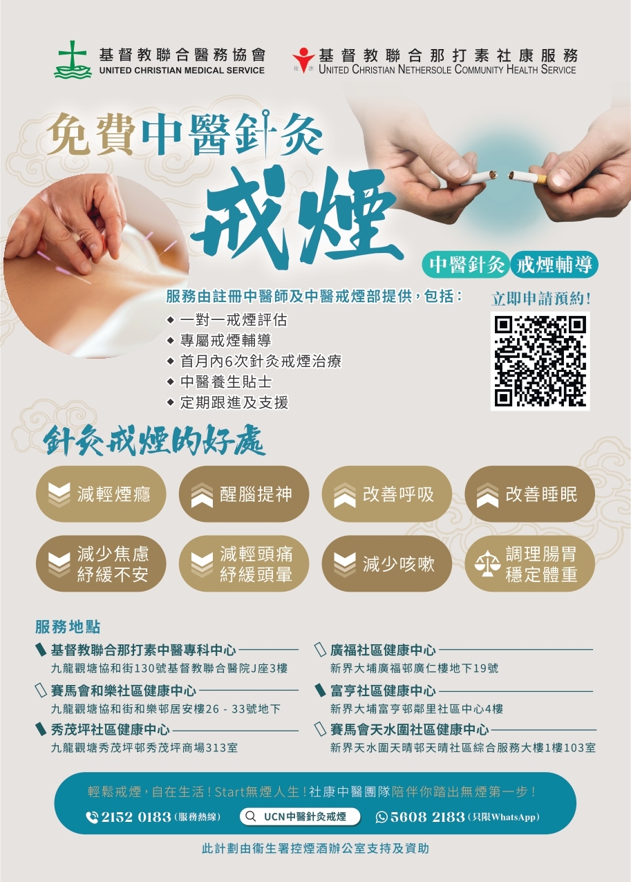 基督教联合那打素社康服务提供中医针灸戒烟计划,费用全免。计划包括戒烟辅导以及中医针灸治疗,由註册中医师主理,帮助戒烟人士纾缓戒烟期间的各种身心不适,让戒烟人士更有效、更轻松地戒烟。