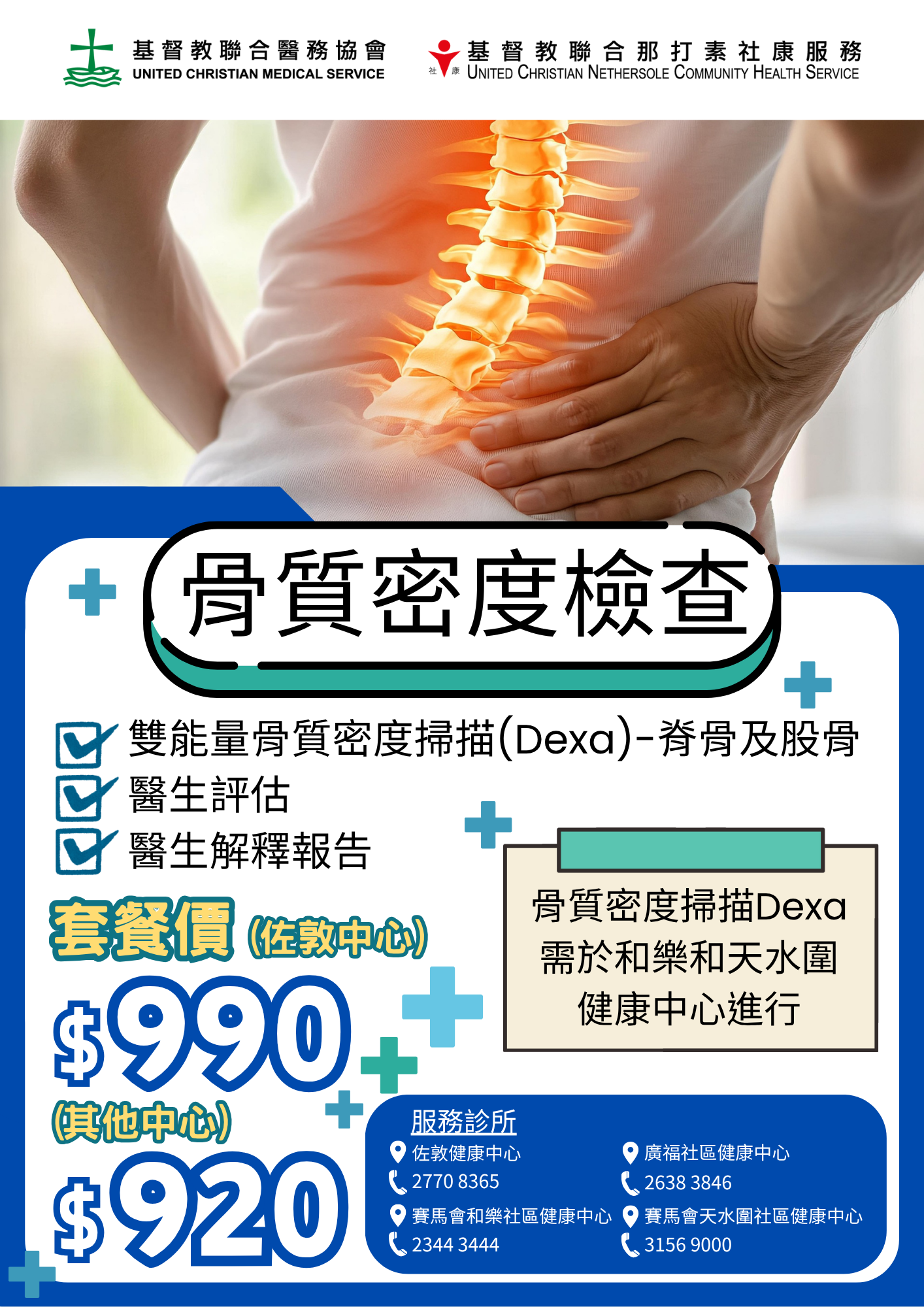 骨質密度檢查,學名 DEXA/DXA,其原理是通過兩種不同能量的 X 光,對人體脊骨與股骨的骨質密度(BMD)進行分析,從而判斷體內骨質流失的情況。這項檢查的輻射劑量極低,僅相當於普通 X 光胸片輻射量的十分之一。整個檢查過程安全和無痛,速度很快,大約 10 分鐘即可完成,是目前臨床診斷骨質疏鬆最常用的方法。