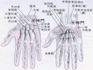 ➢ 神門:腕部內側,小指一側,腕橫紋上的凹陷處,當豌豆骨後方