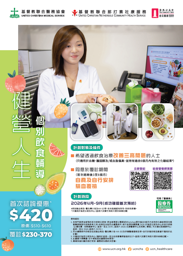 - 本部門與參加者預約首次諮詢日期後,參加者需要以電郵或WhatsApp提交過去6個月內有效之化驗結果至社區營養服務部作諮詢參考之用。如報告未能符合優惠條件,將不能享用優惠價$420於指定日期及中心作首次諮詢(正價收費 - 佐敦健康中心:星期一至五 $570;星期六 $610;社康醫療中心及和樂 / 廣福 / 天水圍社區健康中心:星期一至五 $510;星期六 $570)