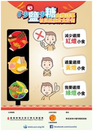 少鹽少糖推廣大使宣傳海報 由註冊營養師及推廣大使走訪九龍城區區內食肆及向食客推廣少鹽少糖的訊息,鼓勵食客「我要少/走甜!」及「我要汁另上!」,以實踐健康飲食。